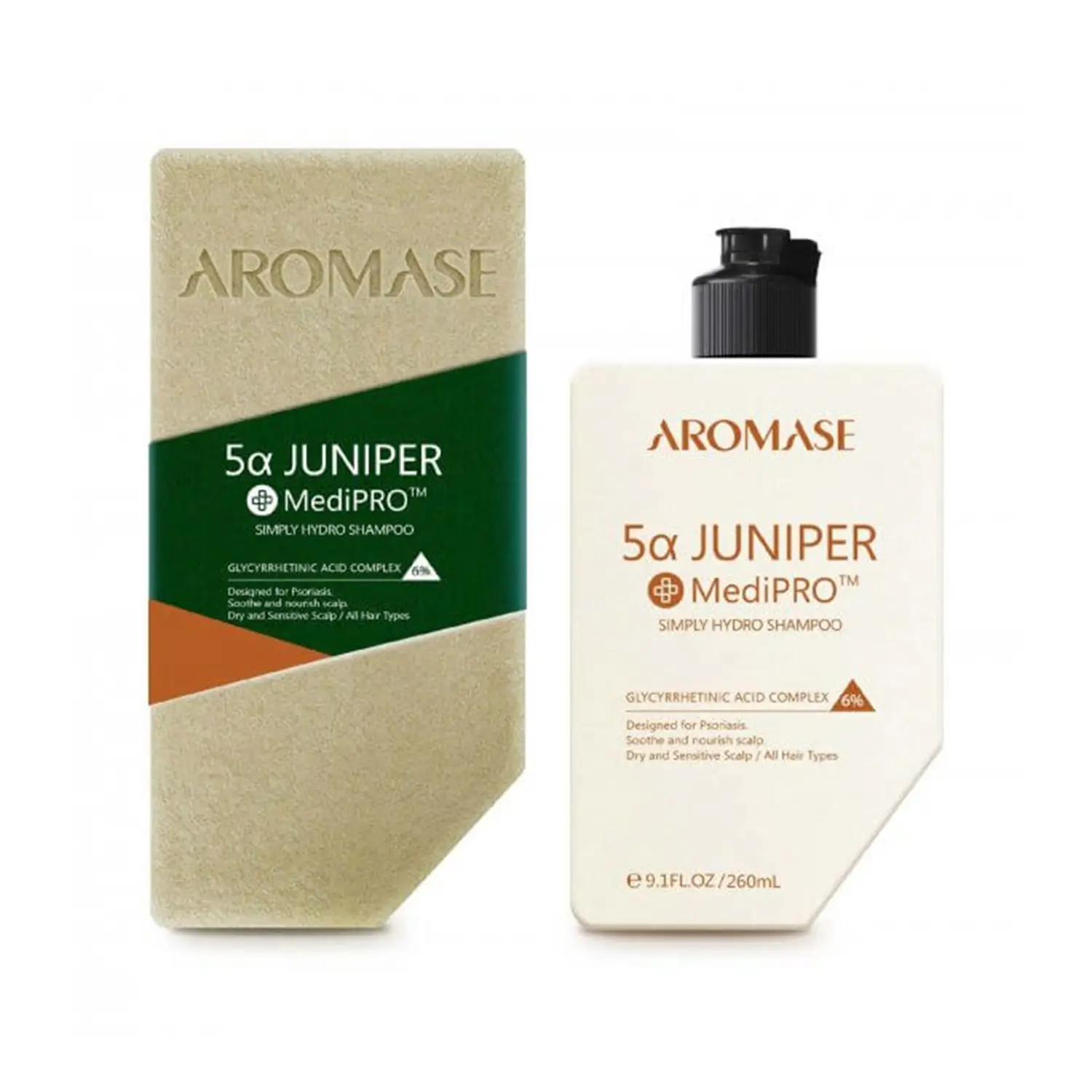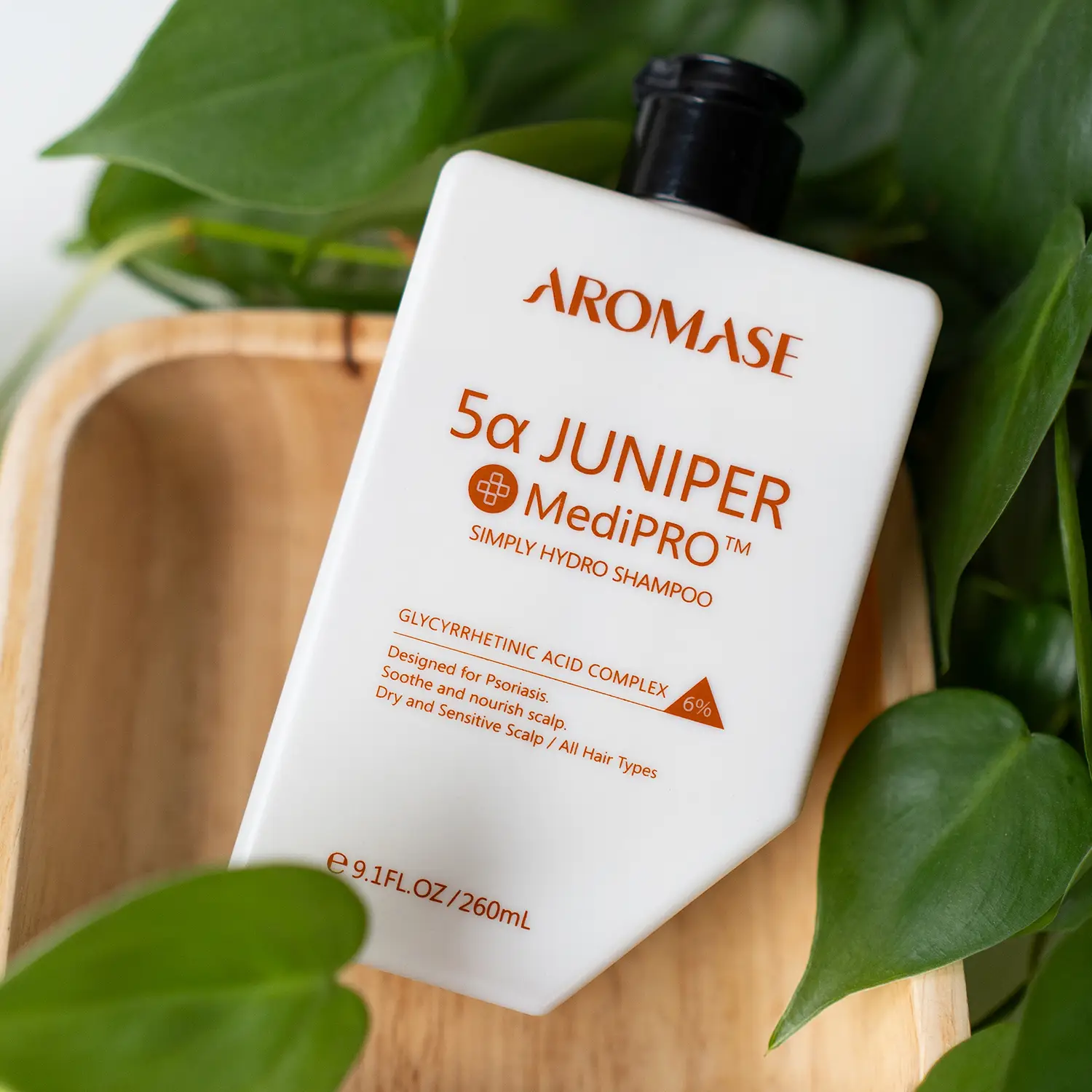 AROMASE MediPRO™ 5α JUNIPER Simply Hydro Shampoo dzięki zawartości 6% stężenia kompleksu kwasu glicyretynowego w szczególności znajduje zastosowanie w przypadku suchej skóry głowy ze zmianami łuszczycowymi, suchej skóry głowy z wypadaniem włosów, łuszczycy wraz ze współistniejącym łysieniem.